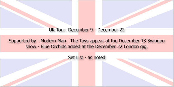 December 9, 1980 (Rotters, Liverpool, UK) December 10, 1980 (Bradford St. George's Hall, UK) December 11, 1980 (Aberystwyth University, UK) December 13, 1980 (Oasis Leisure Centre, Swindon, Wiltshire, UK) December 14, 1980 (Bristol Locarno, UK) December 15, 1980 (Southampton Gaumont, UK) December 16, 1980 (Top Rank, Birmingham, UK) December 19, 1980 (Apollo, Manchester, UK) December 20, 1980 (Rock City, Nottingham, UK) Outside World; Life Begins at the Hop; Helicopter; Love at First Sight; Respectable Street; No Language in Our Lungs; Meccanik Dancing (Oh We Go!); This is Pop?; Scissor Man; Towers of London; Real by Reel; Battery Brides; Living Through Another Cuba; Generals and Majors.