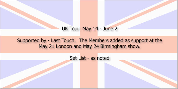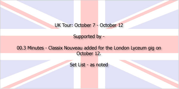 May 14, 1981 (York University, York, UK) May 15, 1981 (University, Sheffield, UK) May 16, 1981 (Tiffany's, Blackpool, UK) May 18, 1981 (Odeon, Edinburgh, UK) May 19, 1981 (Newcastle City Hall, Newcastle, UK) May 20, 1981 (Liverpool University, Liverpool, UK) May 21, 1981 (Hammersmith Odeon, London, UK) May 22, 1981 (Top Rank, Brighton, UK) May 23, 1981 (Bath University, Bath, UK) May 24, 1981 (Odeon, Birmingham, UK) May 26, 1981 (Rotter's, Doncaster, UK) May 27, 1981 (Rock City, Nottingham, UK) May 29, 1981 (University Of East Anglia, Norwich, UK) May 30, 1981 (University of Essex, Colchester, UK) May 31, 1981 (Canterbury Odeon, Canterbury, UK) June 1, 1981 (Queensway Hall, Dunstable, UK) June 2, 1981 (Top Rank, Cardiff, UK) (XTC's final gig in the UK) |