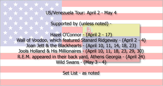 April 30, 1981 (Poliedro, Caracas, Venezuela) May 2, 1981 (Paramount Theatre, Staten Island, NY, US) Real by Reel; Life Begins at the Hop; When You're Near Me I Have Difficulty; Respectable Street; Sgt. Rock (Is Going to Help Me); Snowman; Paper and Iron (Notes and Coins); Ball and Chain; Love at First Sight; No Language in Our Lungs; Scissor Man; Towers of London; Making Plans for Nigel; Living Through Another Cuba; Generals and Majors.